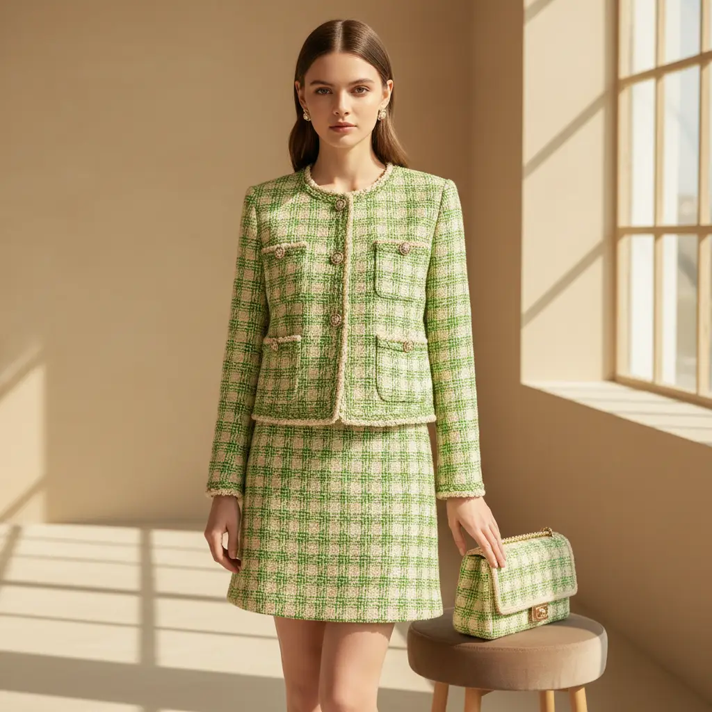 Tessuto Tweed Bouclé in cotone dalla mano morbida e compatta, si presta alla realizzazione di capi esclusivi ed eleganti come l’iconica giacca in tweed della maison Chanel, si presta anche alla creazione di: gonne, abiti e borse esclusive e ricercate.