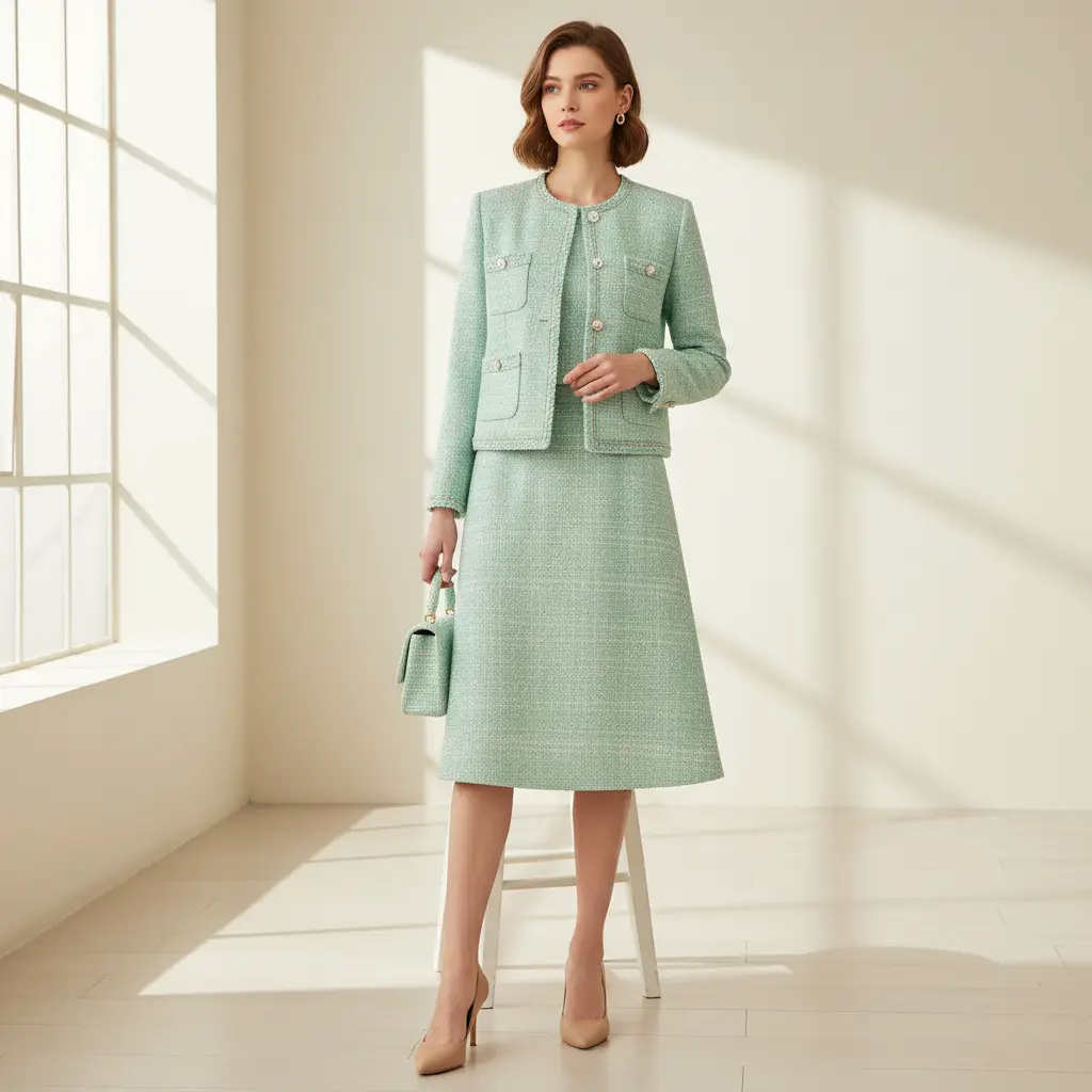 Tessuto Tweed Bouclé in cotone dalla mano morbida e compatta, si presta alla realizzazione di capi esclusivi ed eleganti come l’iconica giacca in tweed della maison Chanel, si presta anche alla creazione di: gonne, abiti e borse.