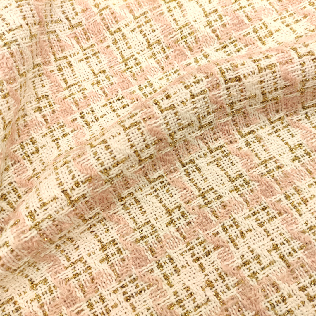 Tessuto Tweed Bouclé lurex dalla mano morbida e compatta, si presta alla realizzazione di capi esclusivi ed eleganti come l’iconica giacca in tweed della maison Chanel, si presta anche alla creazione di: gonne, abiti e borse scintillanti e ricercate.