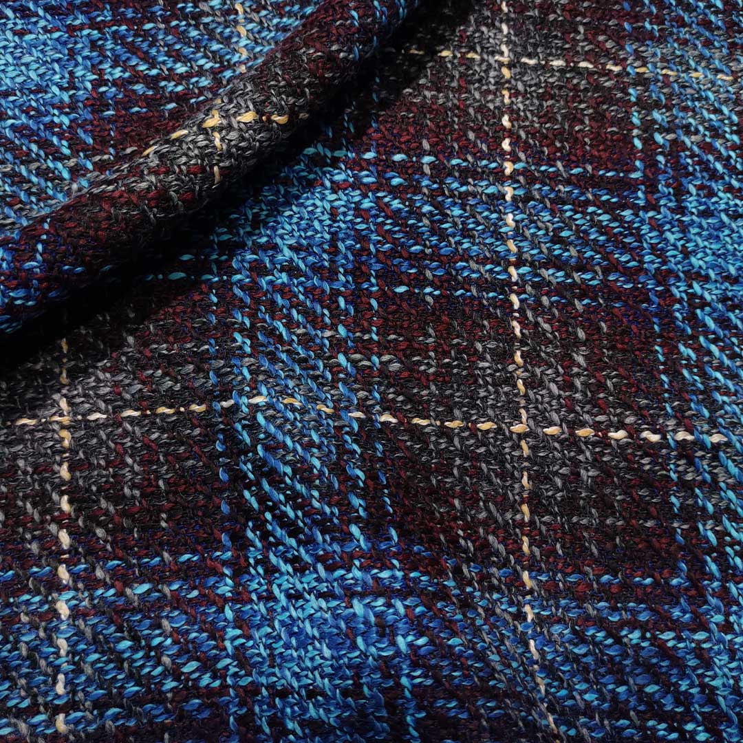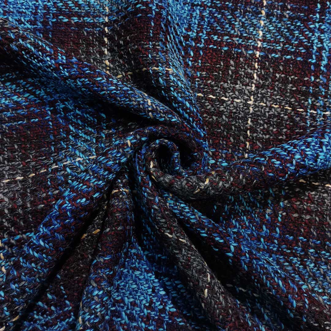 Tessuto Tweed Bouclé motivo quadri con frange ai lati grigio – blu – bordeaux