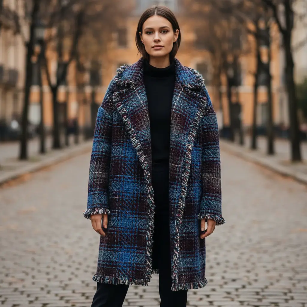 Tessuto tweed con frange ai lati motivo quadri dalla mano morbida, rasata e calda, si presta alla creazione di capi da utilizzare nella stagione autunno – inverno come: mantelle, sciarpe e cappe.