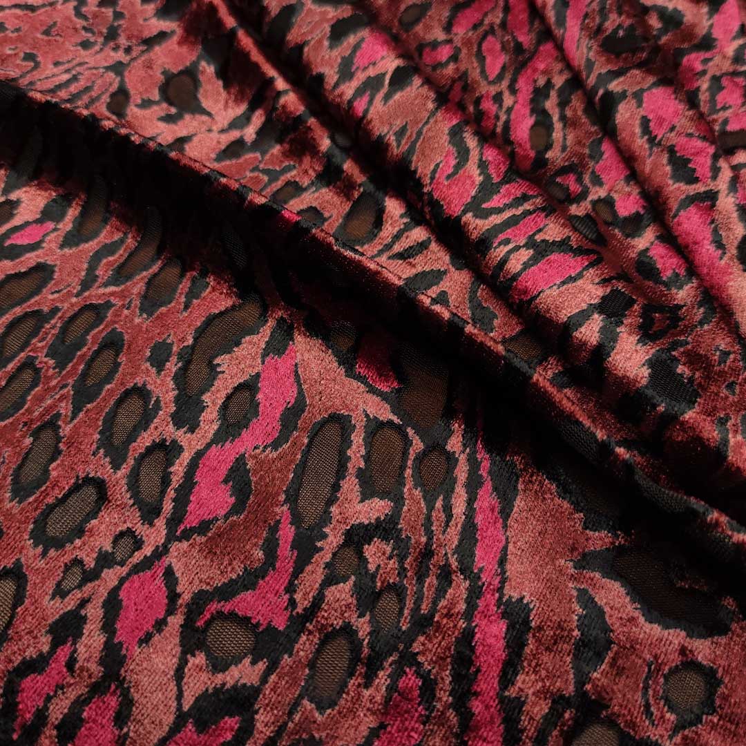 Tessuto Velluto devorè motivo animalier dalla mano morbida e setosa, ideale per realizzare capi eleganti e ricercati da utilizzare nella stagione autunno – inverno come: camicie, abiti, gonne, stole e spolverini.