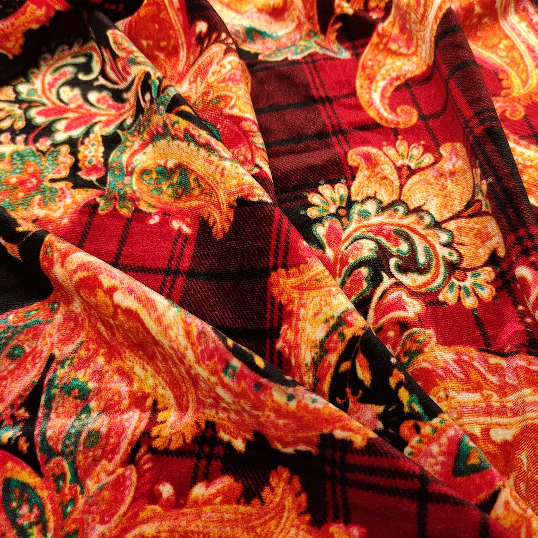 Tessuto Velluto elasticizzato a fantasia dalla mano morbida e soffice ideale per realizzare capi adatti per la stagione autunno – inverno come: abiti, gonne, pantaloni e tute jumpsuit.