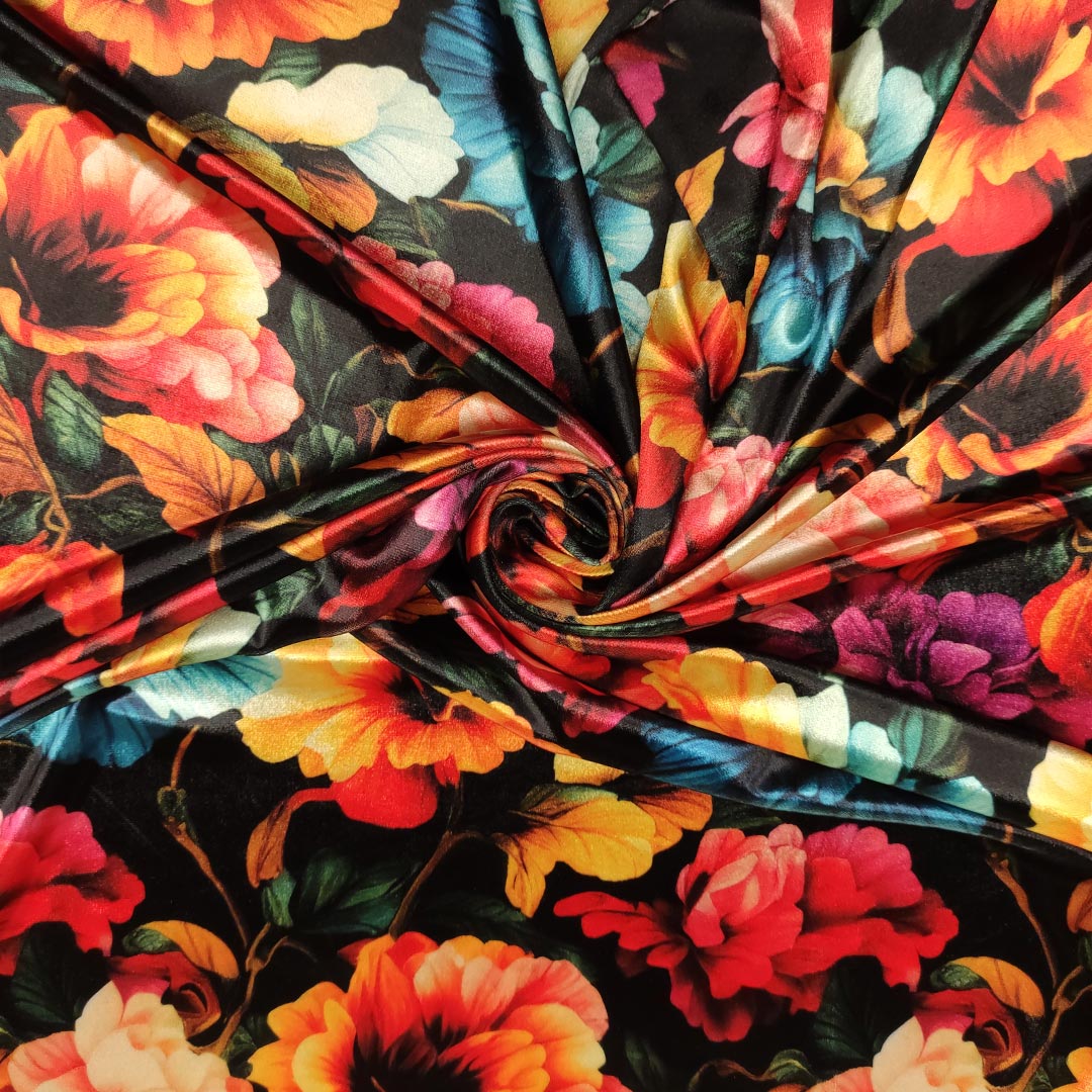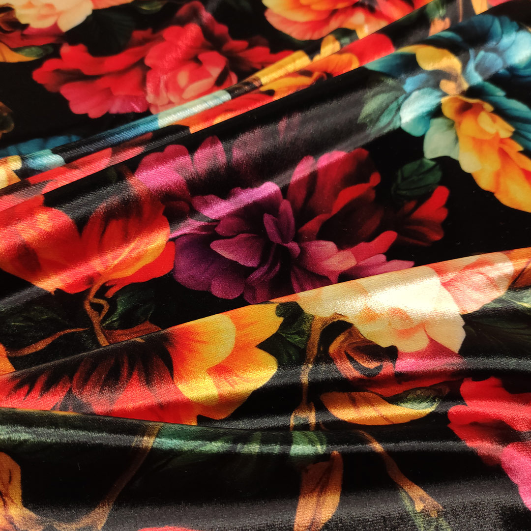 Tessuto Velluto elasticizzato a fantasia dalla mano morbida e soffice ideale per realizzare capi adatti per la stagione autunno – inverno come: abiti, gonne, pantaloni e tute jumpsuit.