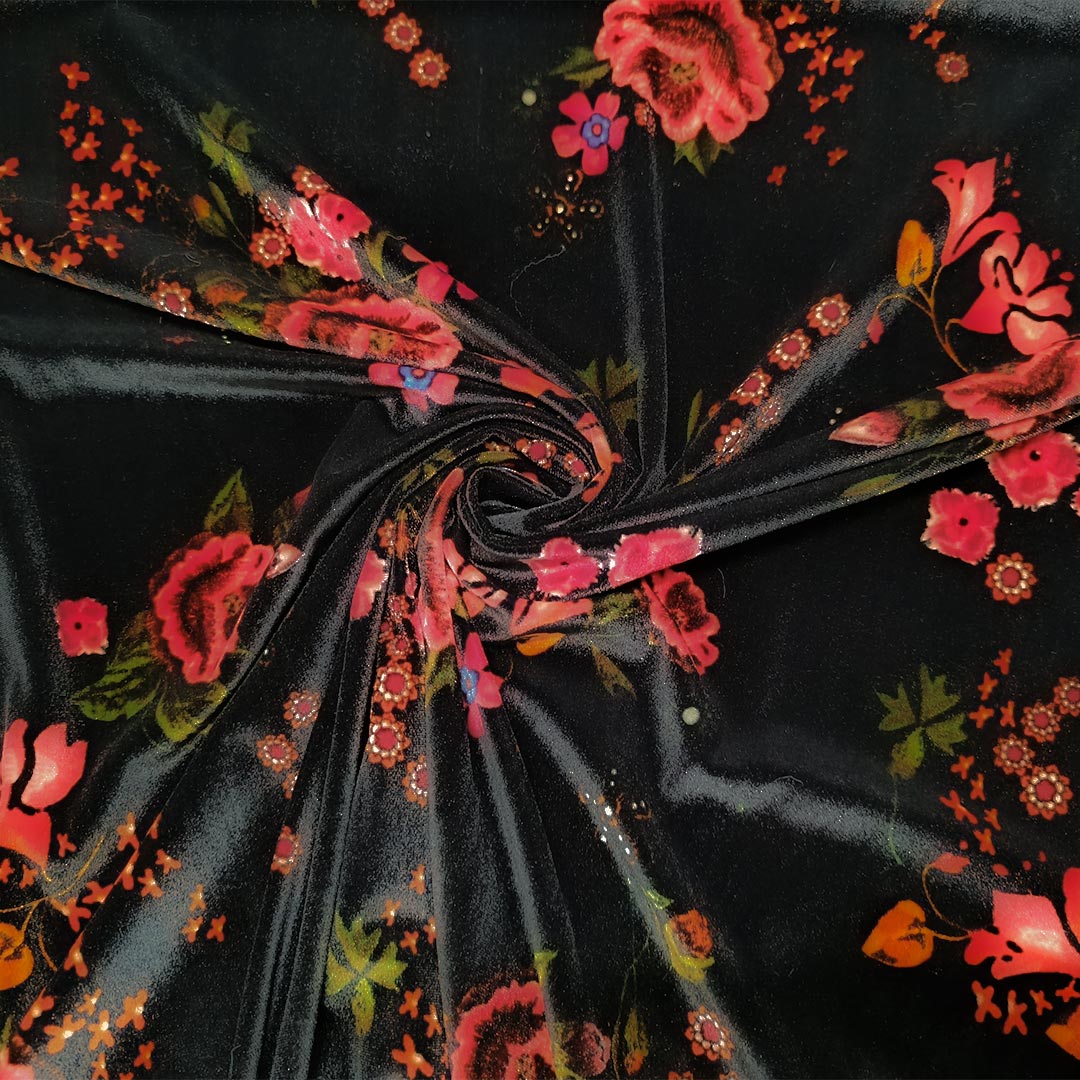 Tessuto Velluto elasticizzato a fantasia motivo floreale nero – rosso – verde acido