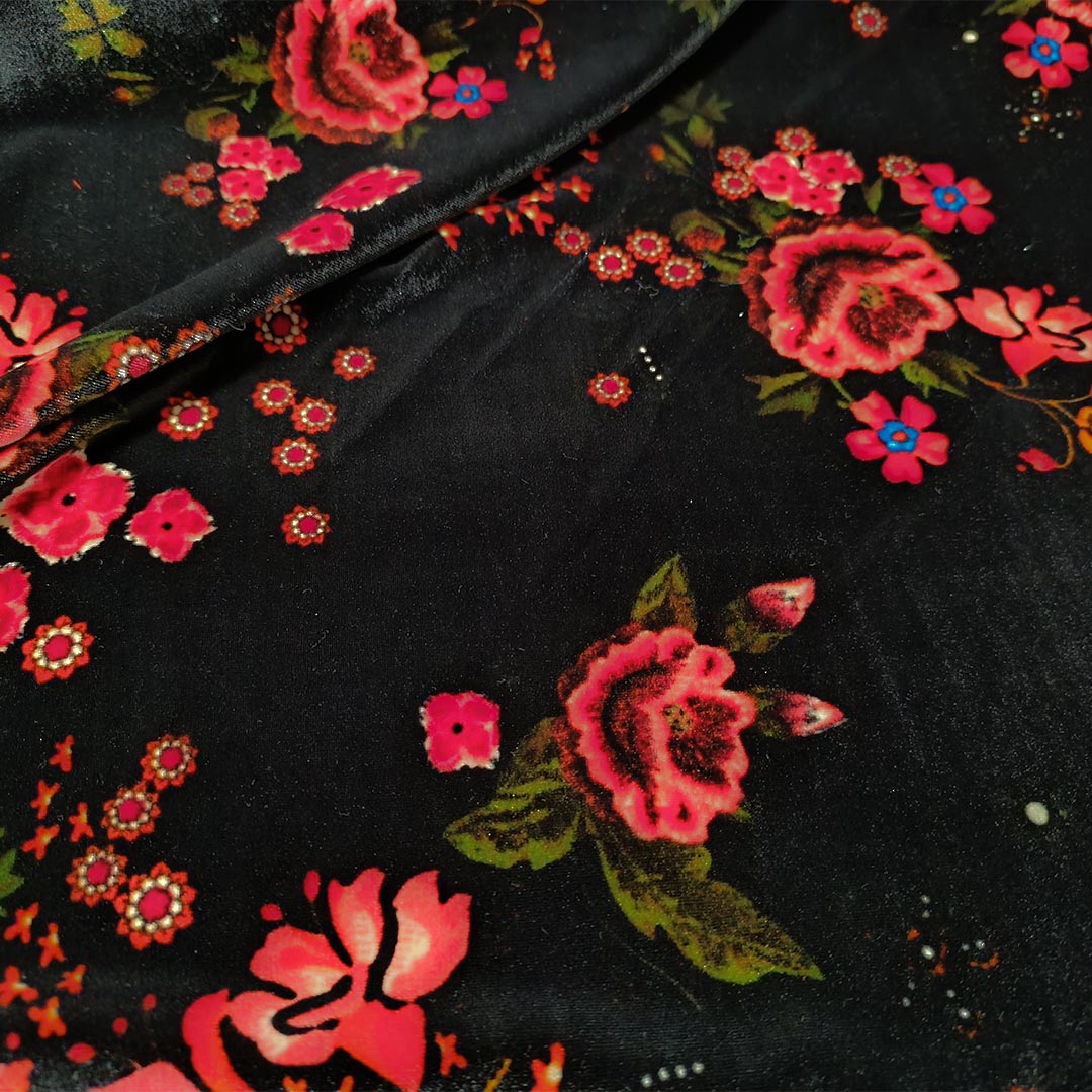 Tessuto Velluto elasticizzato a fantasia dalla mano morbida e soffice ideale per realizzare capi adatti per la stagione autunno – inverno come: abiti, gonne, pantaloni e tute jumpsuit.