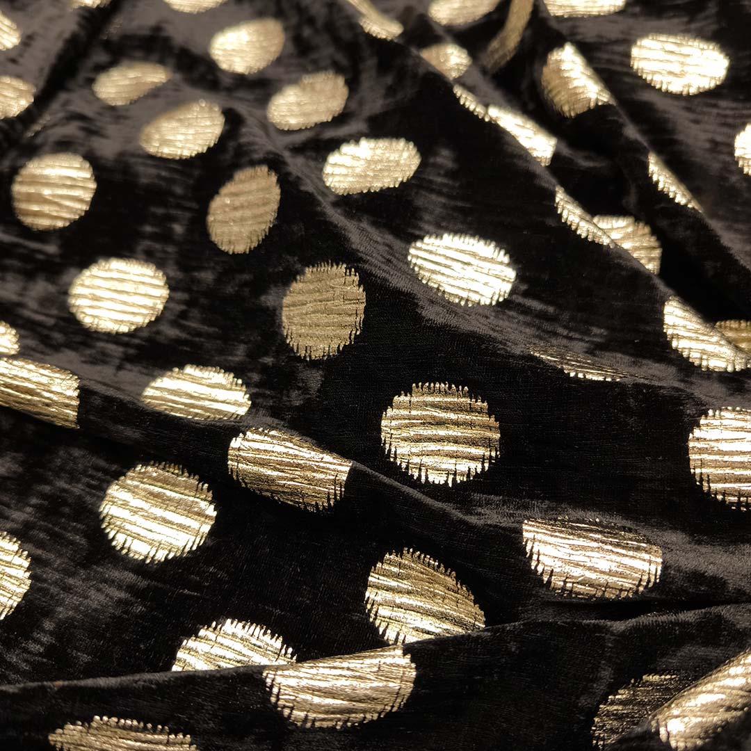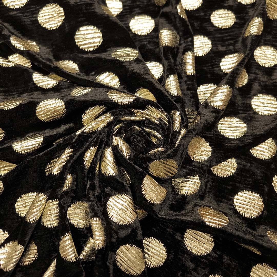 Tessuto Velluto elasticizzato a fantasia motivo pois nero – oro
