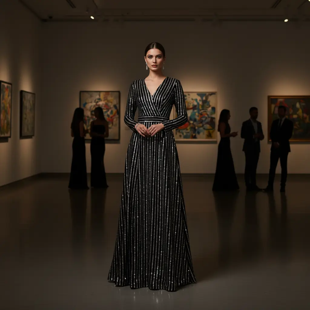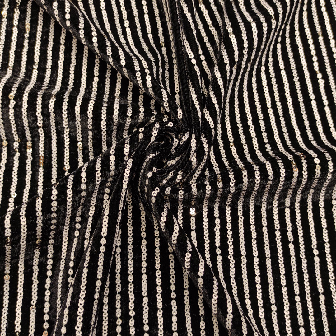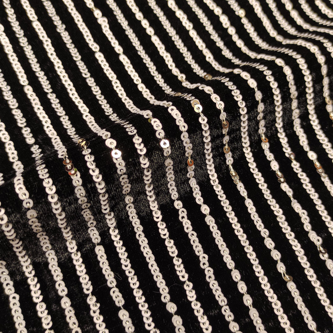 Tessuto Velluto ricamato con paillettes motivo rigato nero – bianco