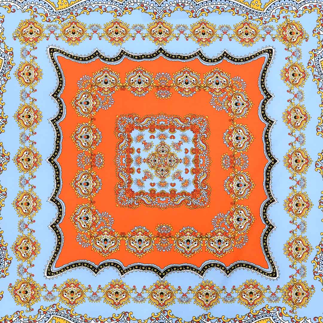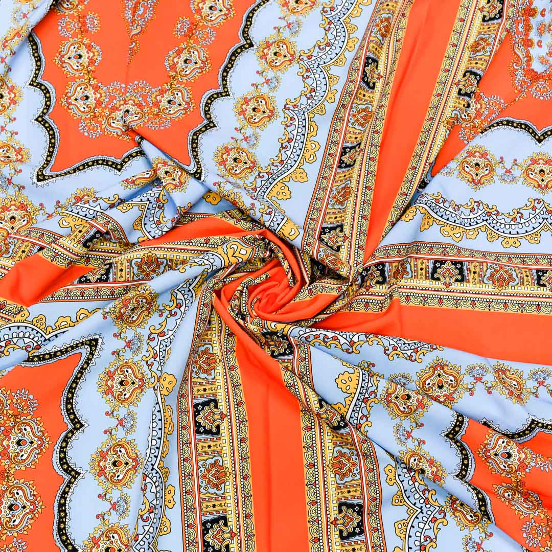 Tessuto Misto Viscosa a fantasia motivo floreale barocco arancione – celeste