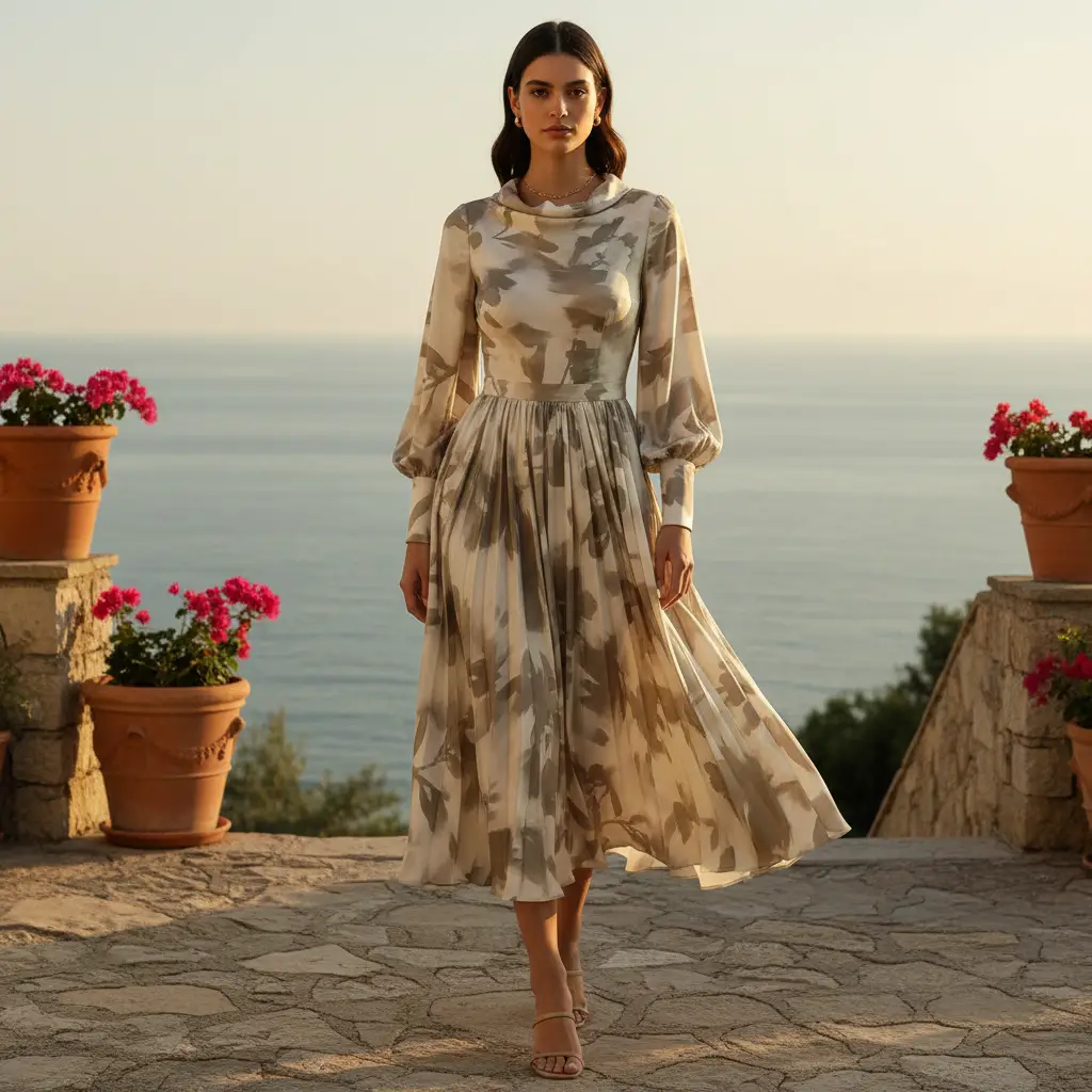 Tessuto Satin di Viscosa a fantasia motivo astratto panna – tortora