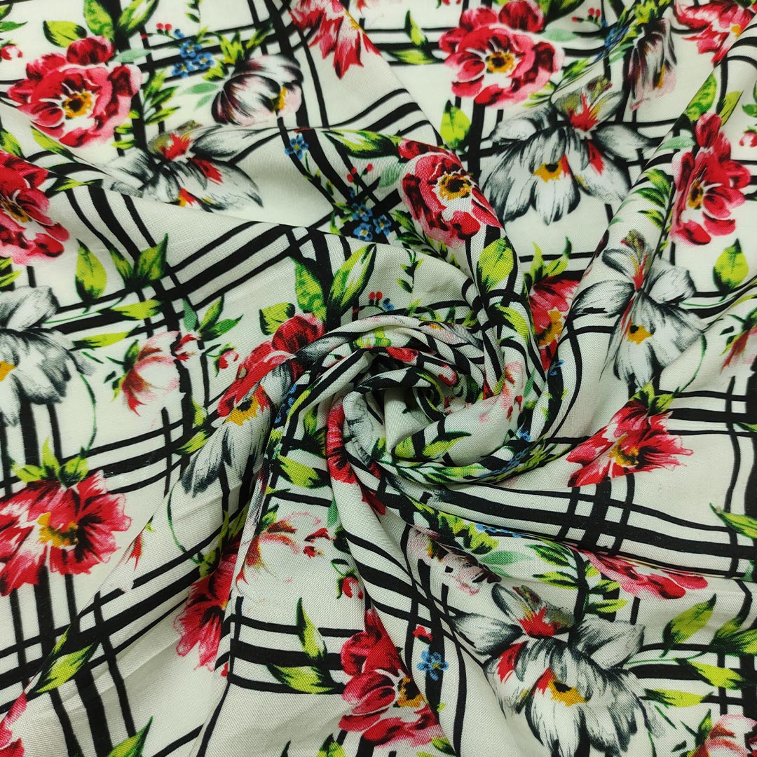 Tessuto Viscosa a fantasia motivo floreale bianco – nero – rosso