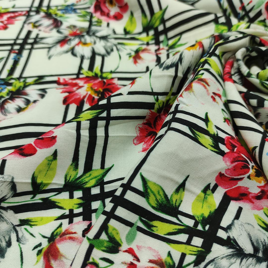 Tessuto Viscosa a fantasia dalla mano morbida e fluente ideale per realizzare capi freschi e comodi da utilizzare nella stagione Primavera-Estate.