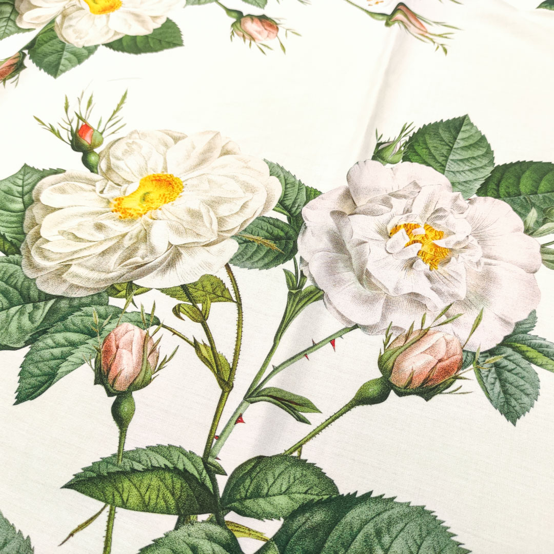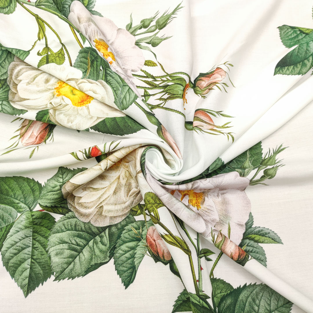 Tessuto Viscosa a fantasia motivo floreale bianco – salvia – cipria