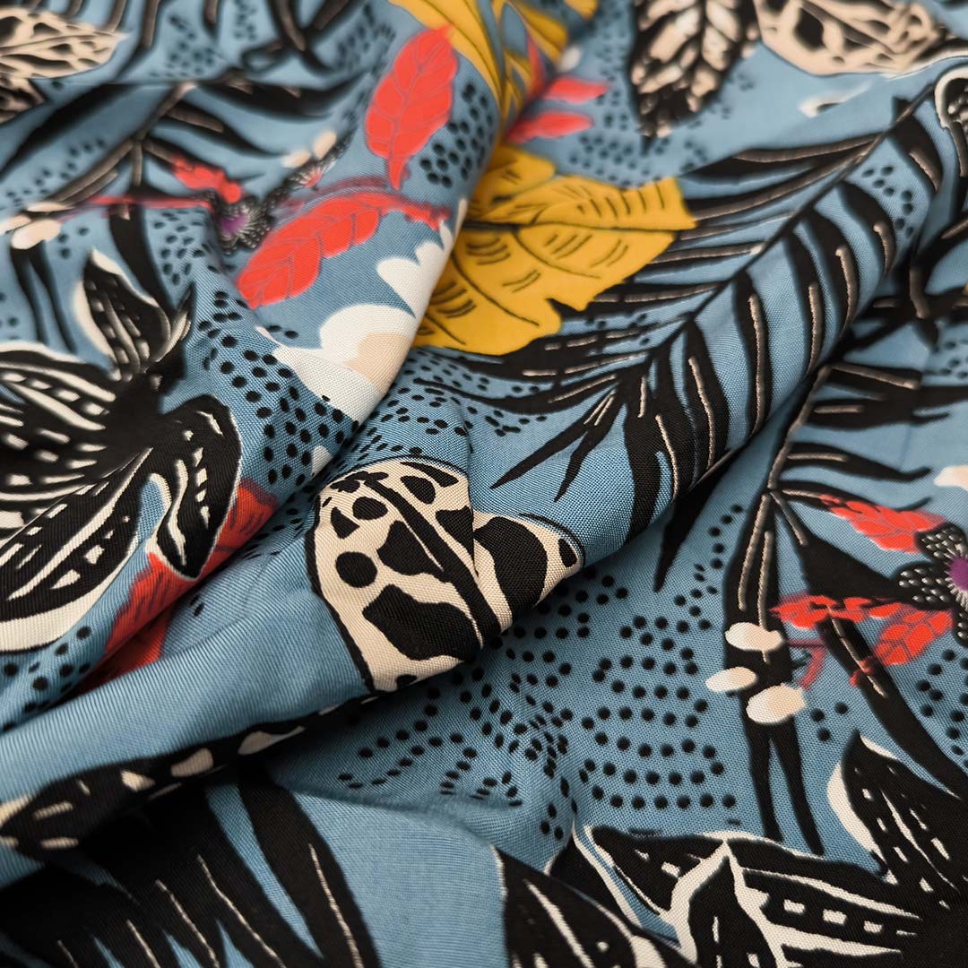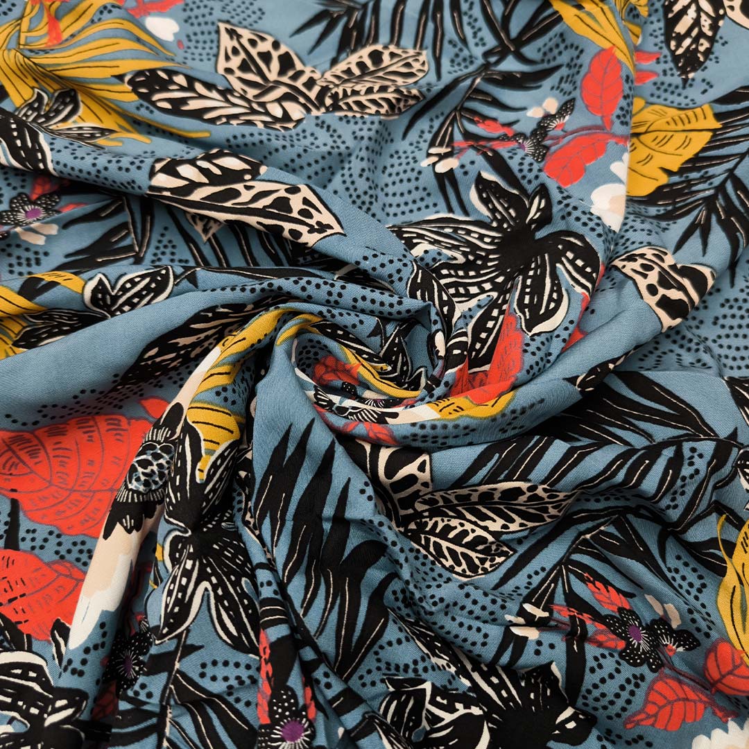 Tessuto Viscosa a fantasia dalla mano morbida e fluente ideale per realizzare capi freschi e comodi da utilizzare nella stagione Primavera-Estate.
