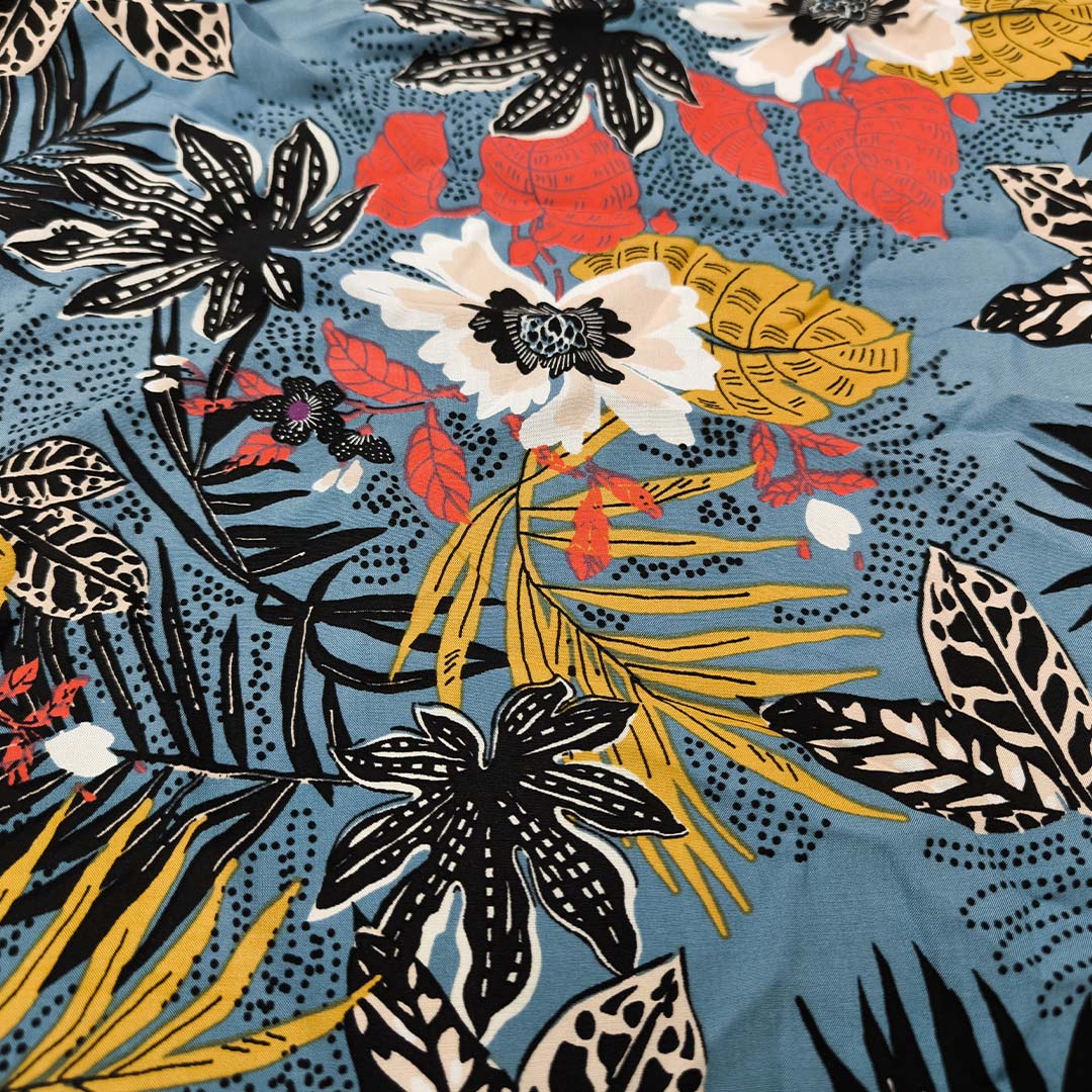 Tessuto Viscosa a fantasia motivo floreale celeste – rosso – ocra