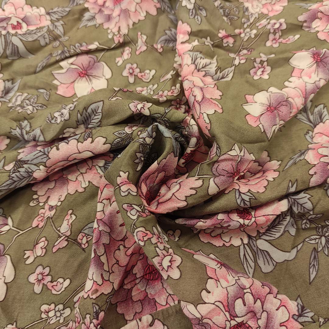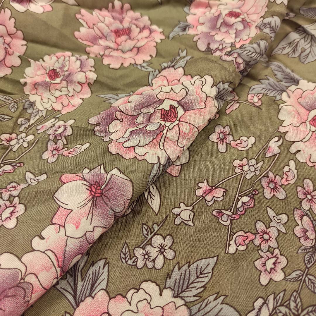 Tessuto Viscosa a fantasia motivo floreale verde – rosa – lilla